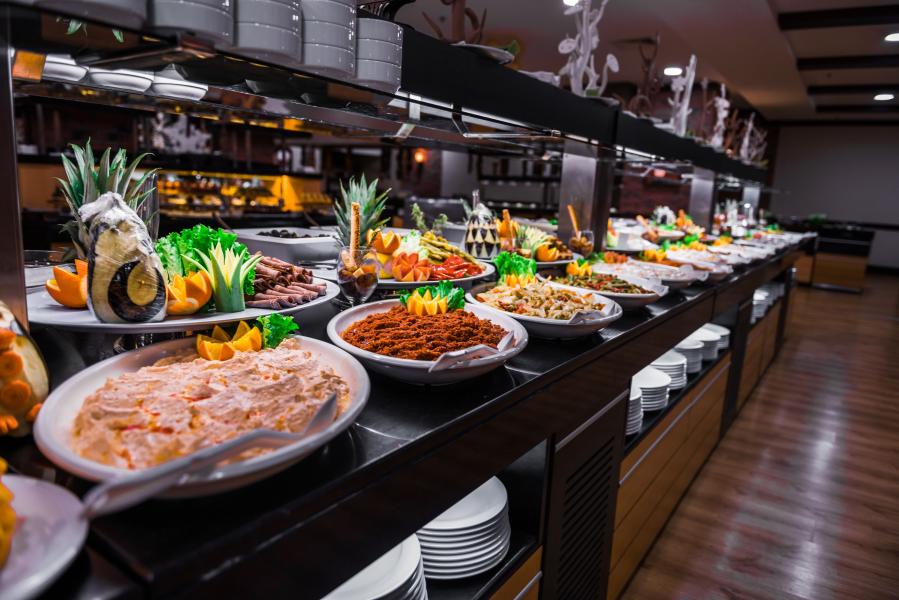 Sabah kahvaltısı, öğle yemeği ve akşam yemeği açık büfe olarak hizmet vermektedir.